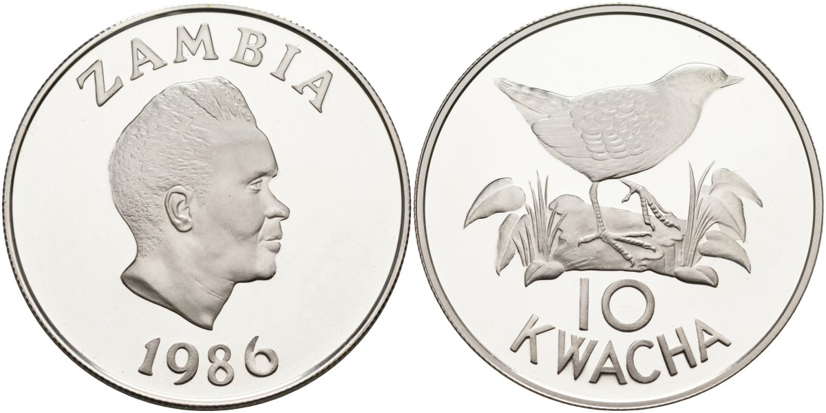 Замбия 10 квача 1986 WWF, серия защита окружающей среды, белокрылый пушистик, тираж 25000 экз. KM 25 серебро PROOF 02-224-33