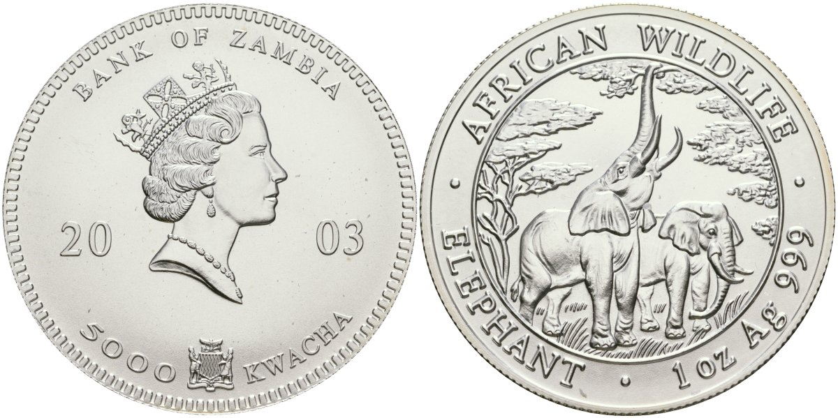 Замбия 5000 квача 2003 Африканские слоны KM 165 серебро UNC 1080-8-51