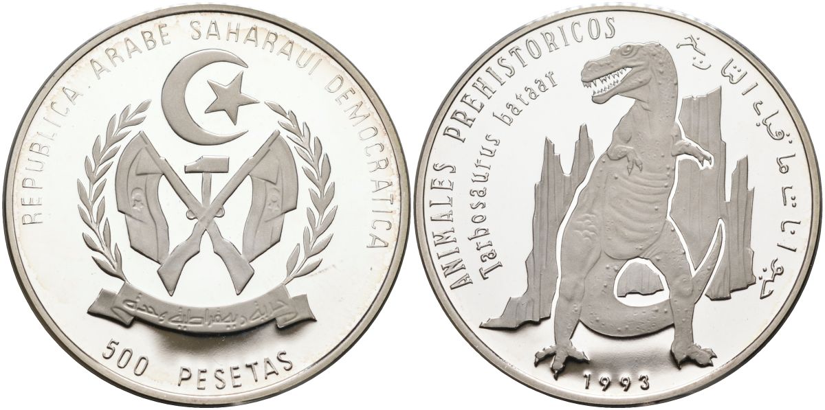 Сахара 500 песет 1993 серия доисторические живоные, тарбозавр батаар KM 12 серебро PROOF 04-138-24