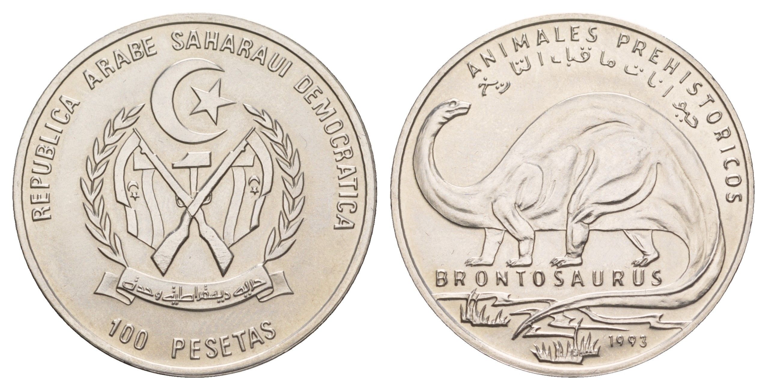 Западная Сахара 100 песет 1993 Доисторические животные - Бронтозавр, тираж 2.000 экземпляров KM 13 сталь плакированная никелем UNC 413-6533