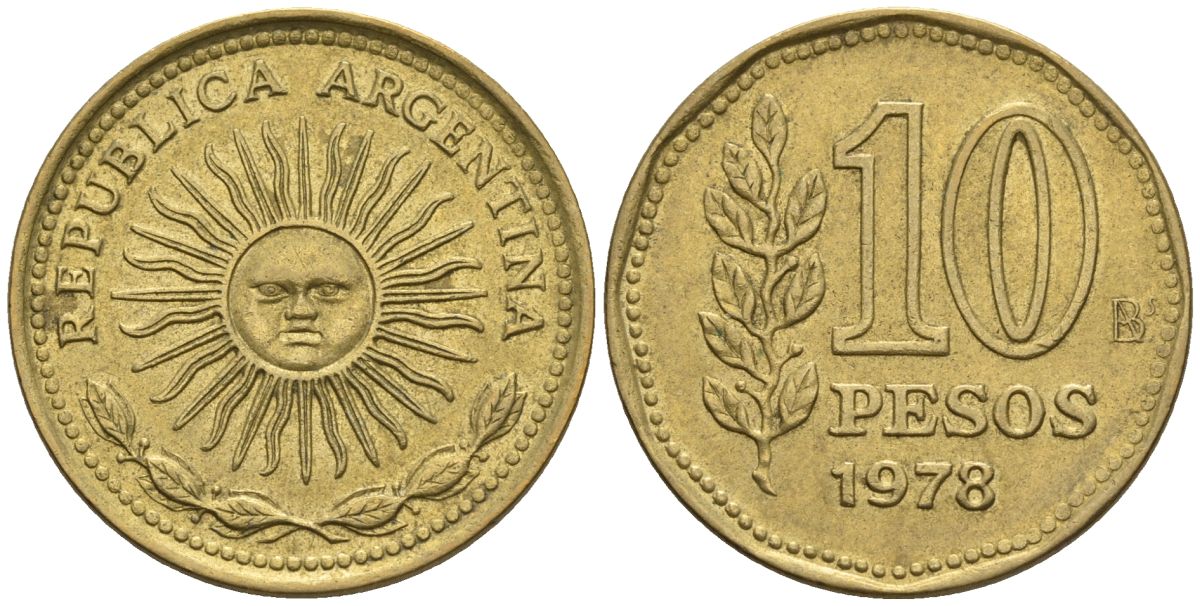 Аргентина 10 песо 1978 Ba, майское солнце KM 72, CJ 321, Schon 72 алюминиевая бронза 60-515