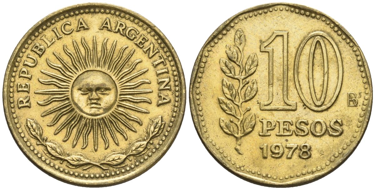 Аргентина 10 песо 1978 Ba, майское солнце KM 72, CJ 321, Schon 72 алюминиевая бронза 60-517