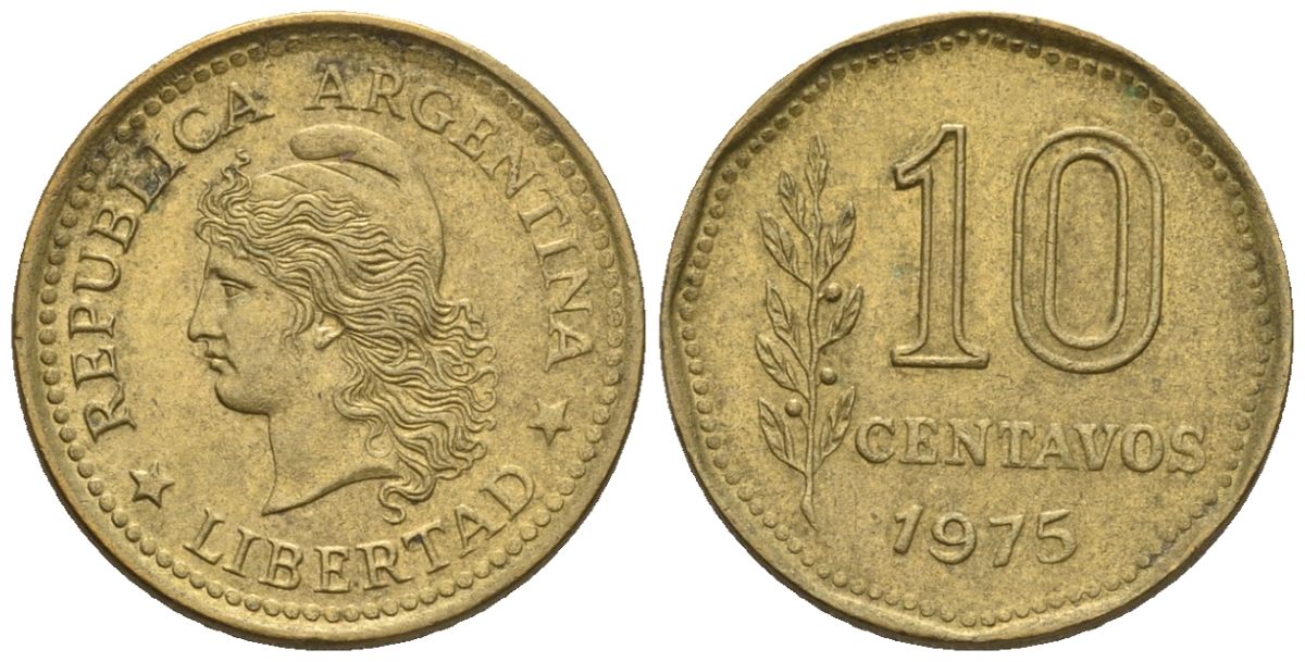 Аргентина 10 сентаво 1975 голова свободы влево KM 66, CJ 348, Schon 66 алюминиевая бронза 4609-1223