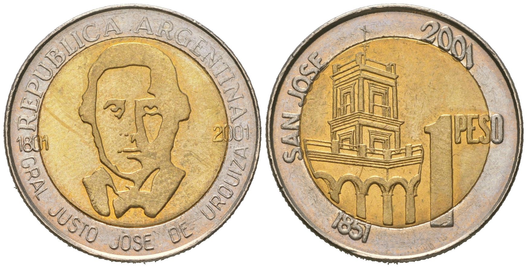 Аргентина 1 песо 2001 200 лет со дня рождения Хусто Хосе де Уркиза KM 132 биметалл UNC 4619-1122