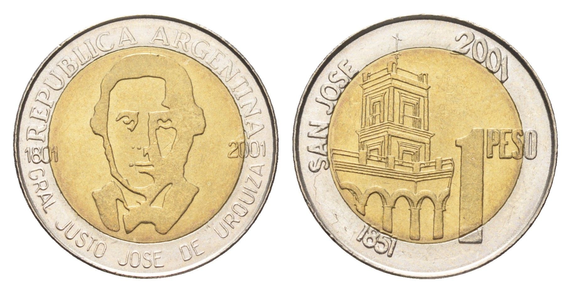 Аргентина 1 песо 2001 200 лет со дня рождения Хусто Хосе де Уркиза KM 132 биметалл UNC 4662-656