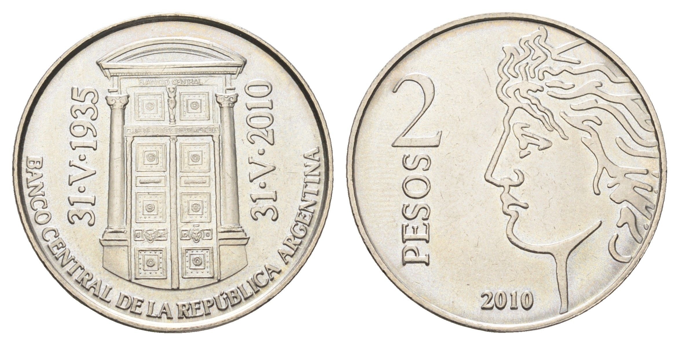 Аргентина 2 песо 2010 75 лет Центральному банку Аргентины KM 162 медно-никель BU 4661-245