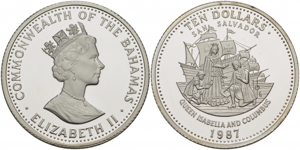 БАГАМСКИЕ ОСТРОВА 10 ДОЛЛАРОВ 1987 САН САЛЬВАДОР, КОРОЛЕВА ИЗАБЕЛЛА И КОЛУМБ KM 120 серебро PROOF 05-095-12