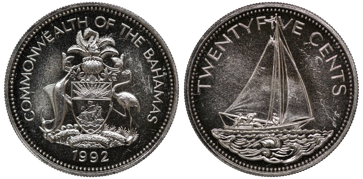 Багамские острова 25 центов 1992 парусник KM 63.2 медно-никель 00-00