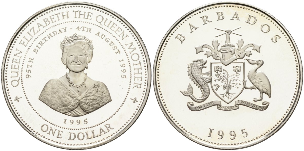 Барбадос 1 доллар 1995 95 лет со дня рождения Королевы-матери KM 65 серебро PROOF 1096-4-23