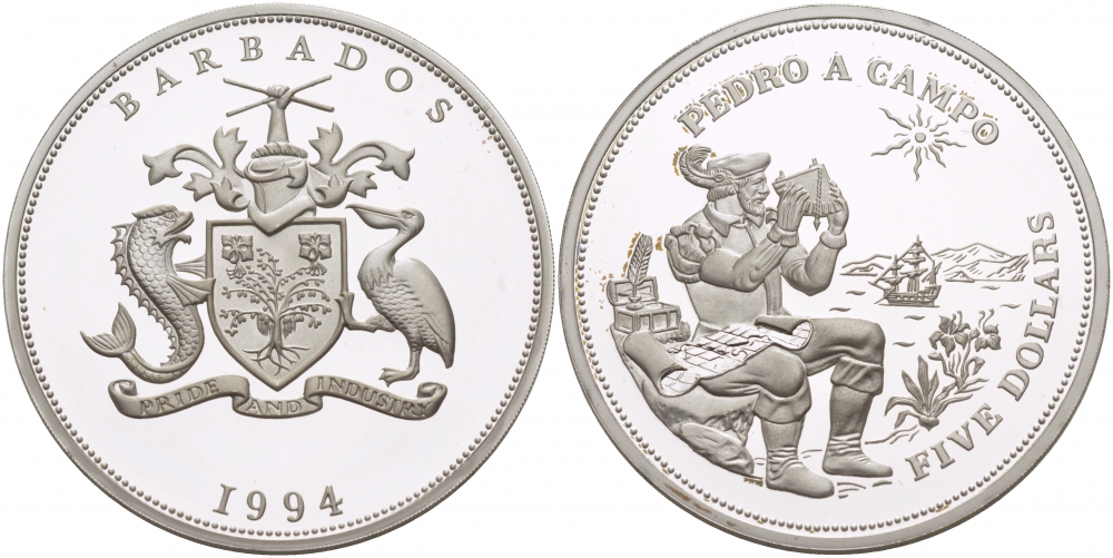 Барбадос 5 долларов 1994 история мореплавания, Педро А. Кампо KM 59 серебро PROOF 1068-1-51