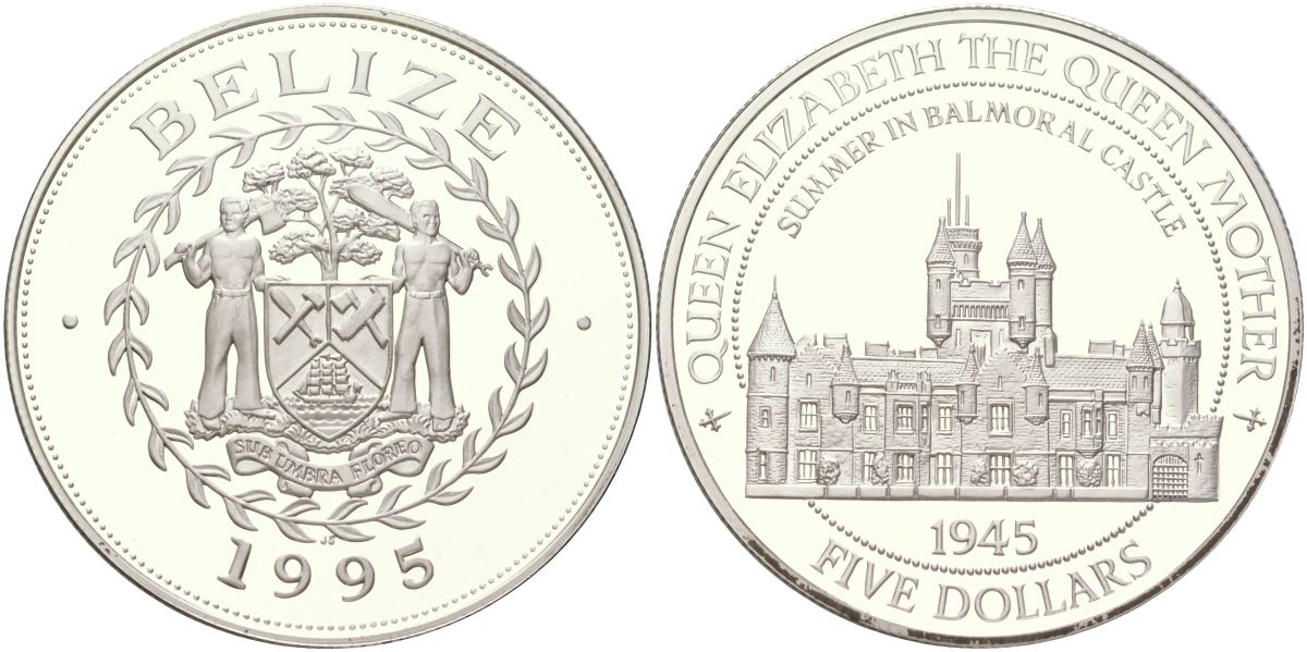Белиз 5 долларов 1995 96 лет со дня рождения Королевы-матери, замок Балморал KM 126 серебро PROOF 01-235-41