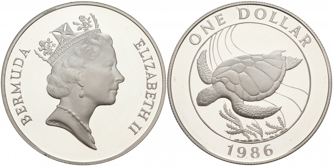 Бермудские острова 1 доллар 1986 серия 25 лет защиты окружающей среды, морская черепаха КМ 49 a серебро PROOF 02-073-14
