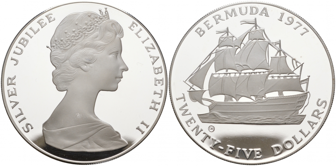 БЕРМУДСКИЕ ОСТРОВА 25 ДОЛЛАРОВ 1977 CHI, СЕРЕБРЯННЫЙ ЮБИЛЕЙ КОРОЛЕВЫ ЕЛИЗАВЕТЫ, ПАРУСНИК, ВЕС 54,75 ГР., ТИРАЖ 5613 ЭКЗ. KM 25 серебро PROOF 02-009-22