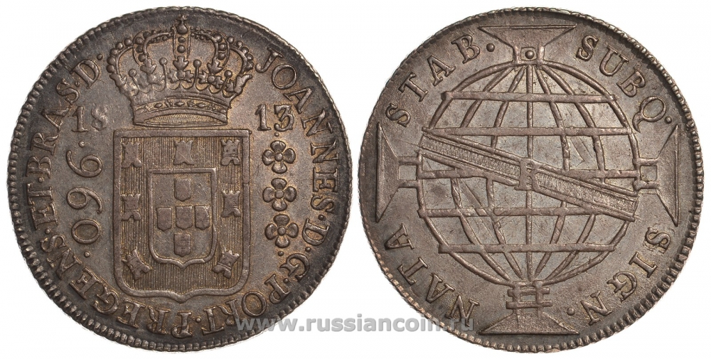 Бразилия Португальская 960 рейс 1813 R перечекан из 1812 KM 307.3 серебро 00-804-14