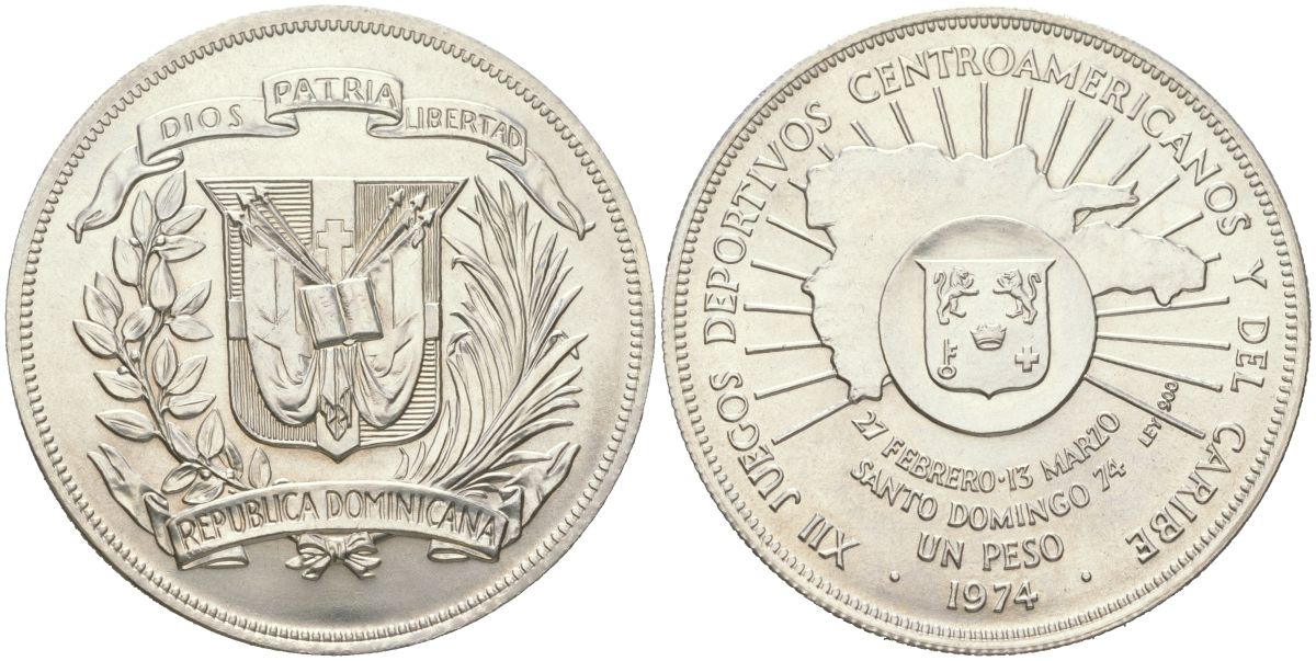 Доминиканская Республика 1 песо 1974 XII Центрально-Американские и Карибские игры KM 35 серебро UNC 1530-1015
