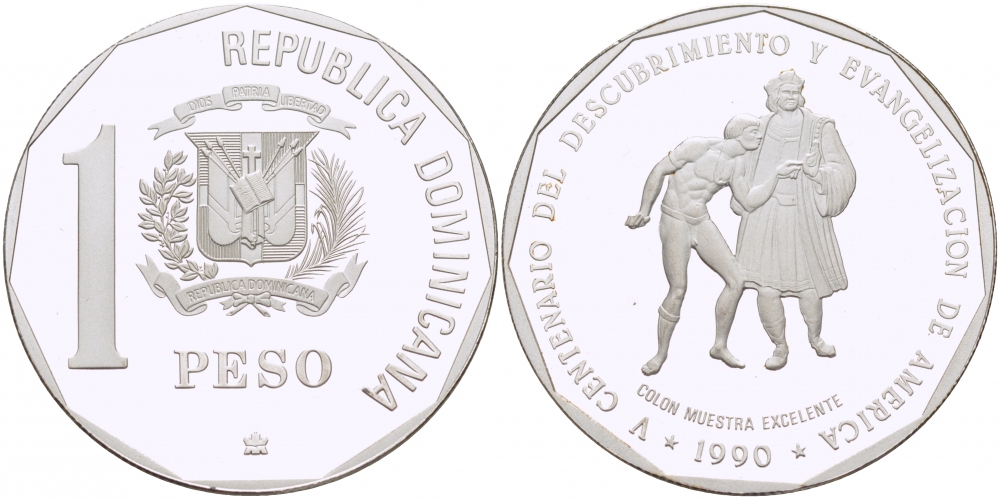 ДОМИНИКАНСКАЯ РЕСПУБЛИКА 1 ПЕСО 1990 500 ЛЕТ ОТКРЫТИЯ АМЕРИКИИ, ЕВАНГЕЛИСТЫ KM 77а серебро PROOF 1068-2-12