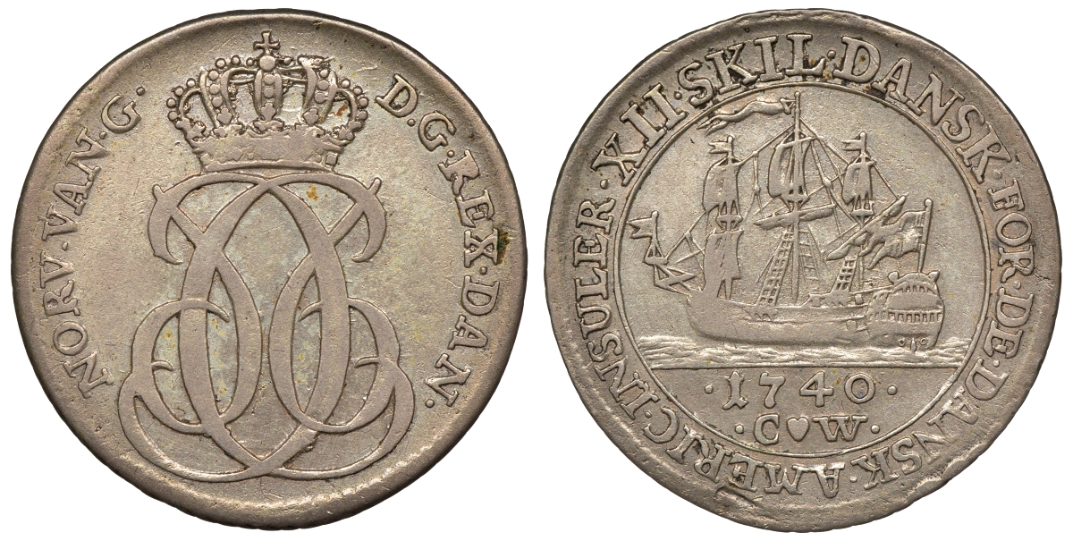 Датская Вестиндия 12 скиллингов 1740 KM 4 серебро 02-205-14