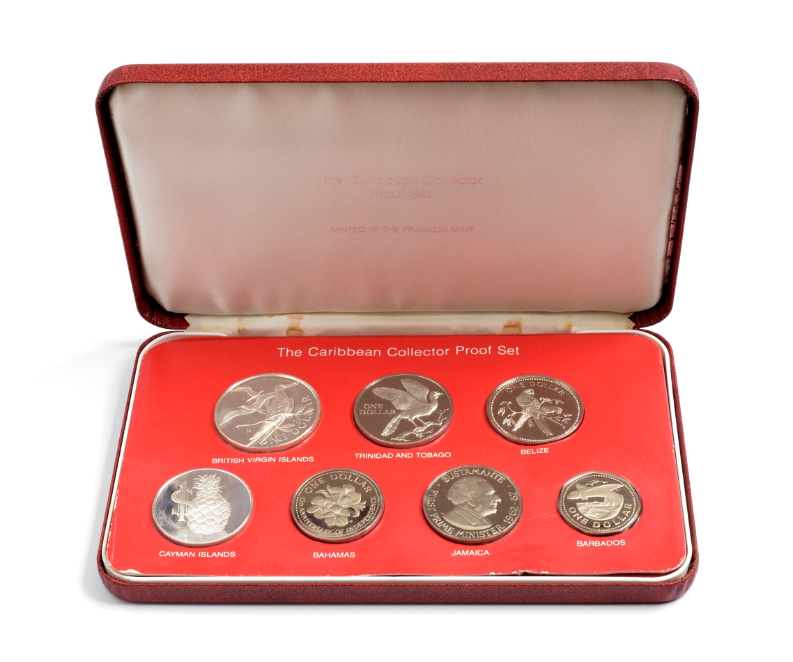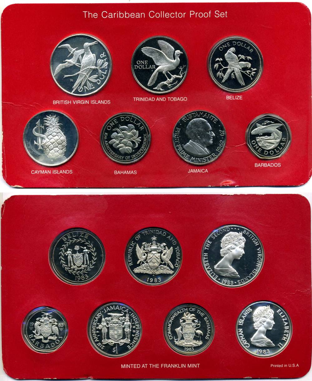 Карибские страны набор из 7 монет 1983 Британские Виргинские острова, Тринидад и Тобаго, Белиз, Каймановы острова, Багамские острова, Ямайка, Барбадос, в запайке в оригинальной коробке с сертификатом есть серебро PROOF 4-5-1-26