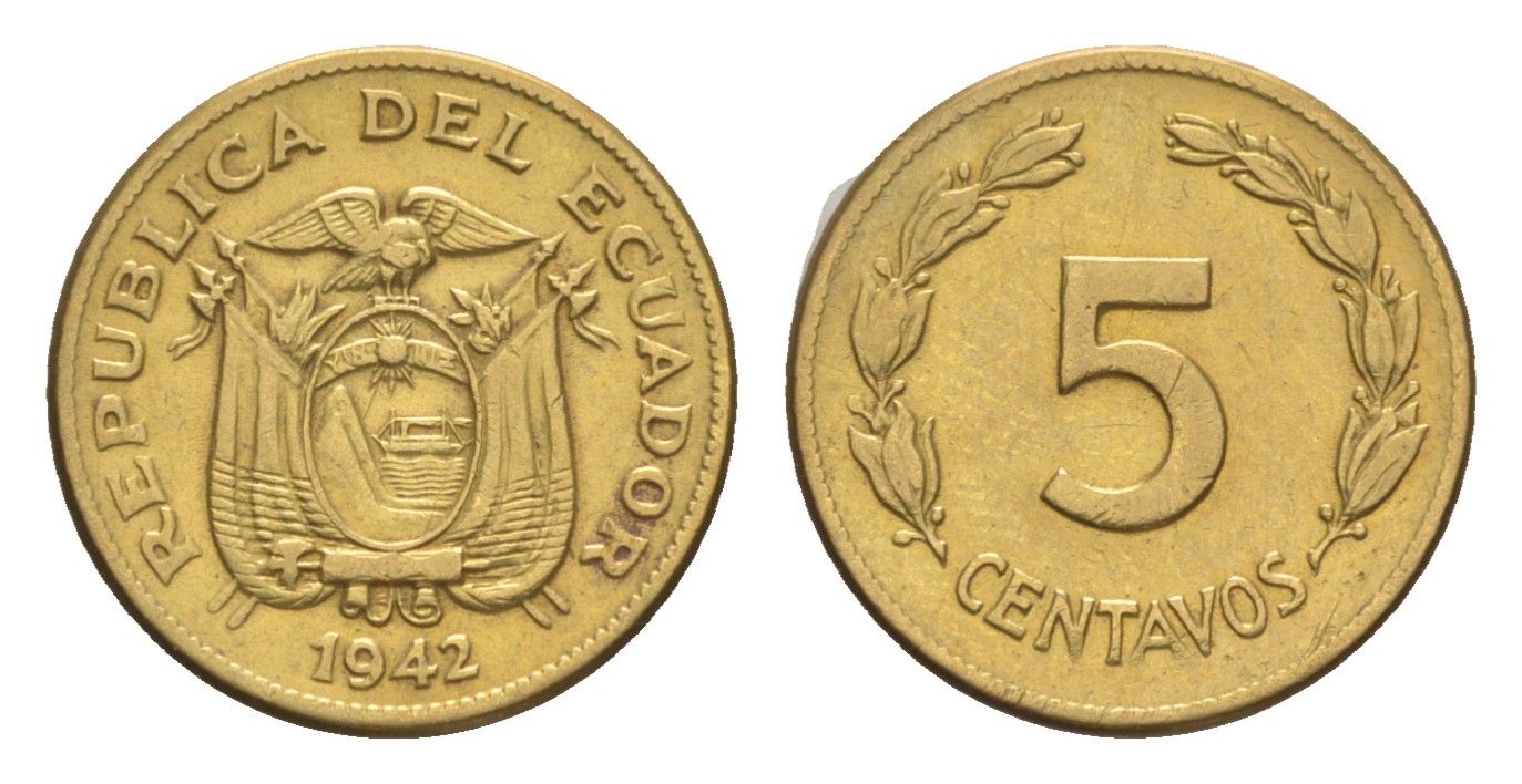 Эквадор 5 сентаво 1942 KM 75a латунь 1528-1344