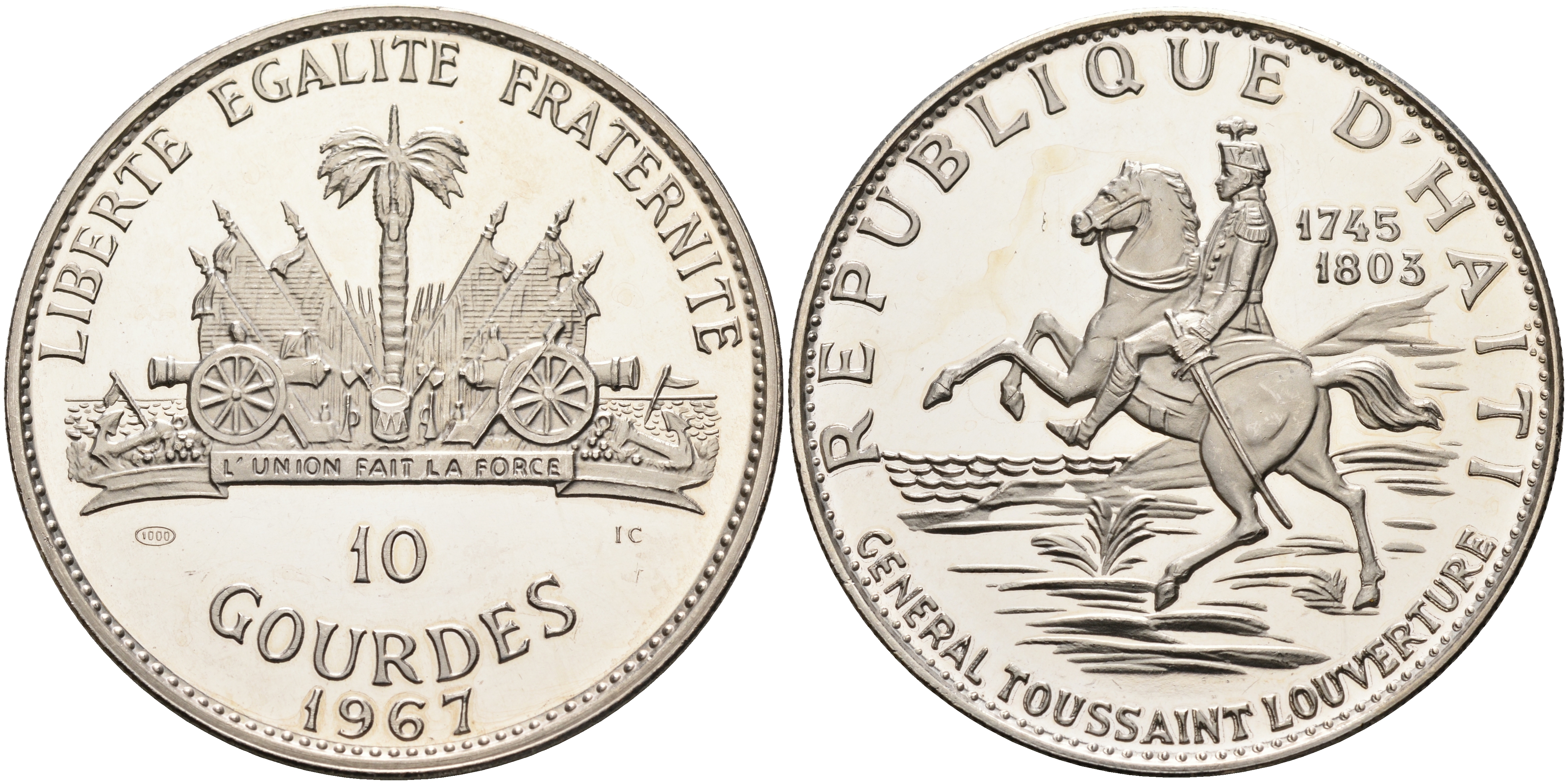 Гаити 10 гурдов 1967 10 лет революции, Генерал Туссен Лувертюр KM 65.1 серебро PROOF 1069-3-43