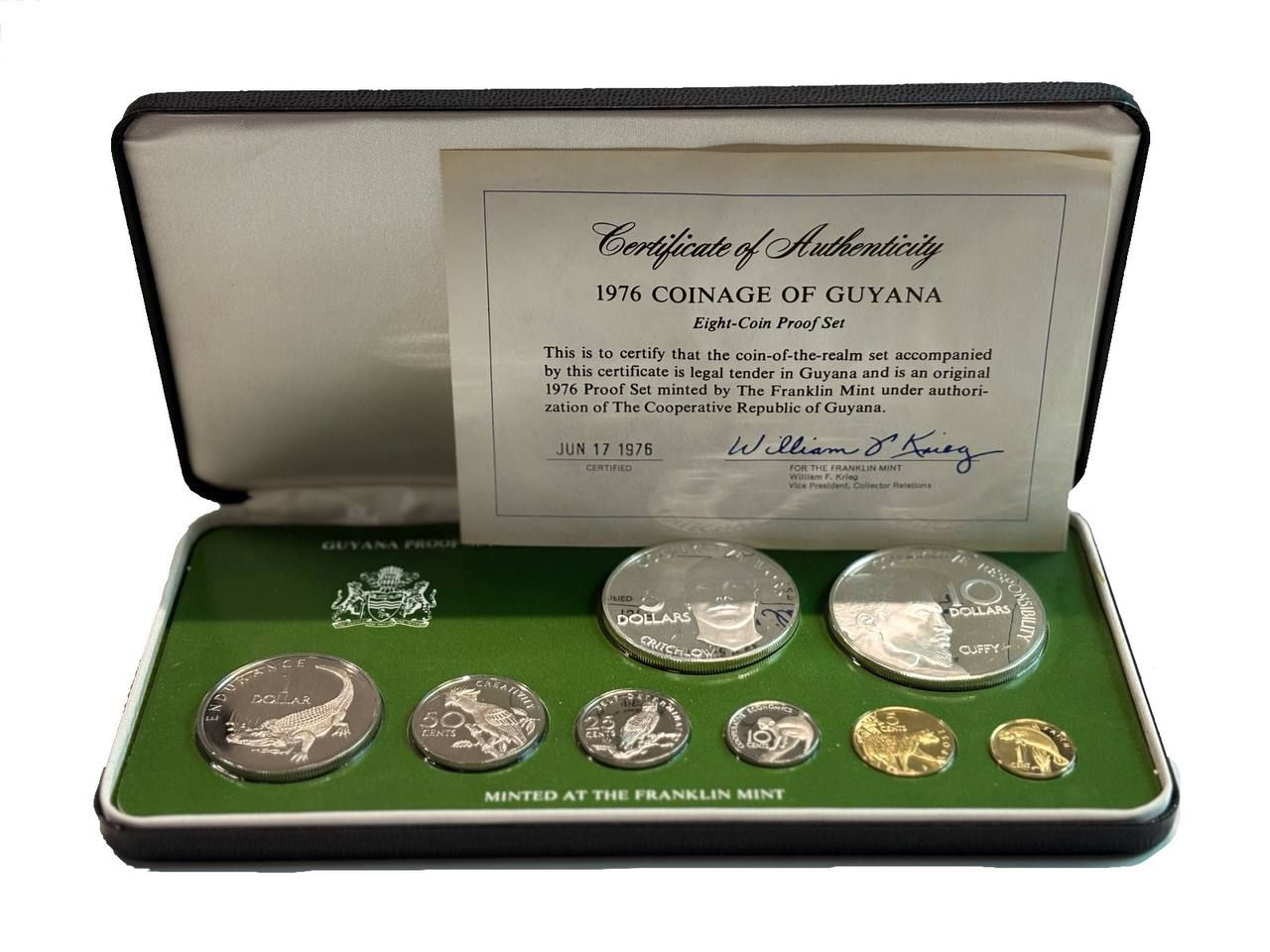 ----Гайана набор из 8 монет (1, 5, 10, 25 и 50 центов; 1, 5 и 10 долларов) 1976 10 лет Независимости, в оригинальной упаковке, с сертификатом подлинности KM 37, 38, 39, 40, 41, 42, 43a и 44a) PROOF 4-3-1-19