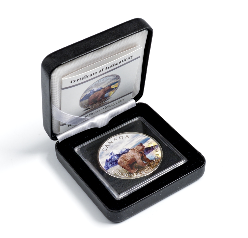 Канада 5 долларов 2011 серия Животный мир Канады, медведь гризли, в оригинальной коробке с сертификатом тираж 5000 экз., цветная эмаль серебро UNC 5-5-1-13