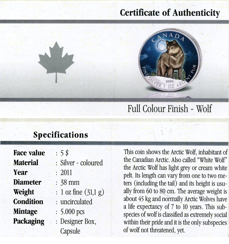 Канада 5 долларов 2011 серия Животный мир Канады, волк, в оригинальной коробке с сертификатом тираж 5000 экз., цветная эмаль серебро UNC 4-3-2-12