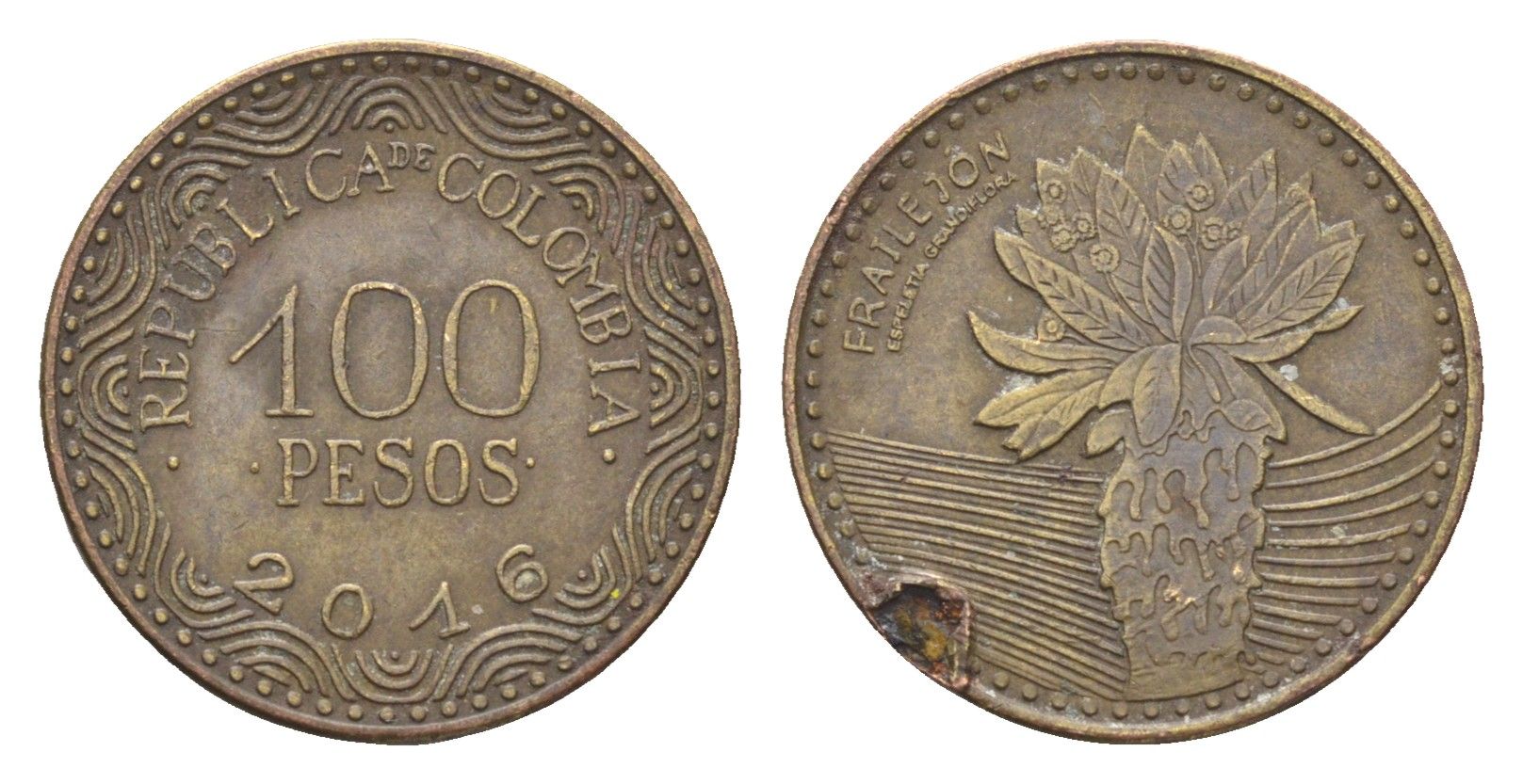 Колумбия 100 песо 2016 KM 296 сталь плакированная латунью 4664-468
