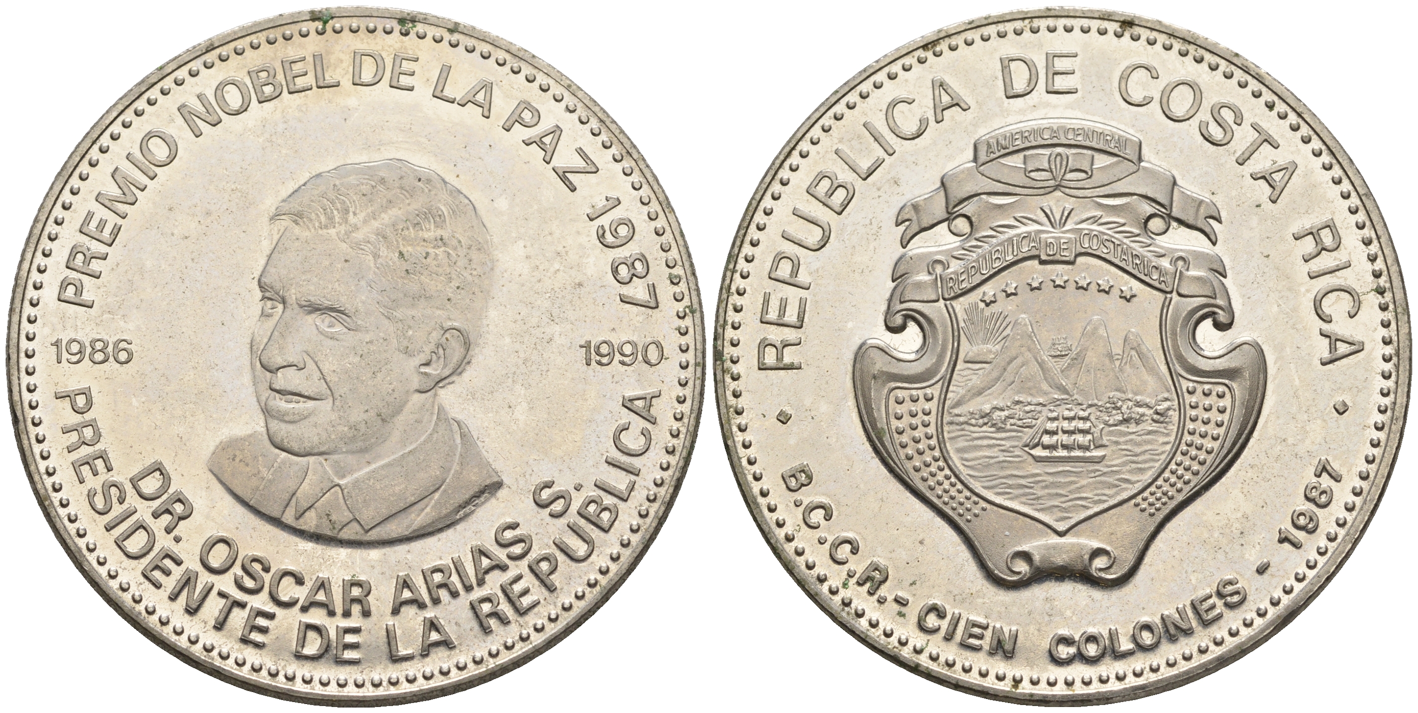 Коста-Рика 100 колон 1987 Оскар Ариас, лауреат Нобеловской премии, президент (1986-1990) KM 224 медно-никель UNC 11-144-14