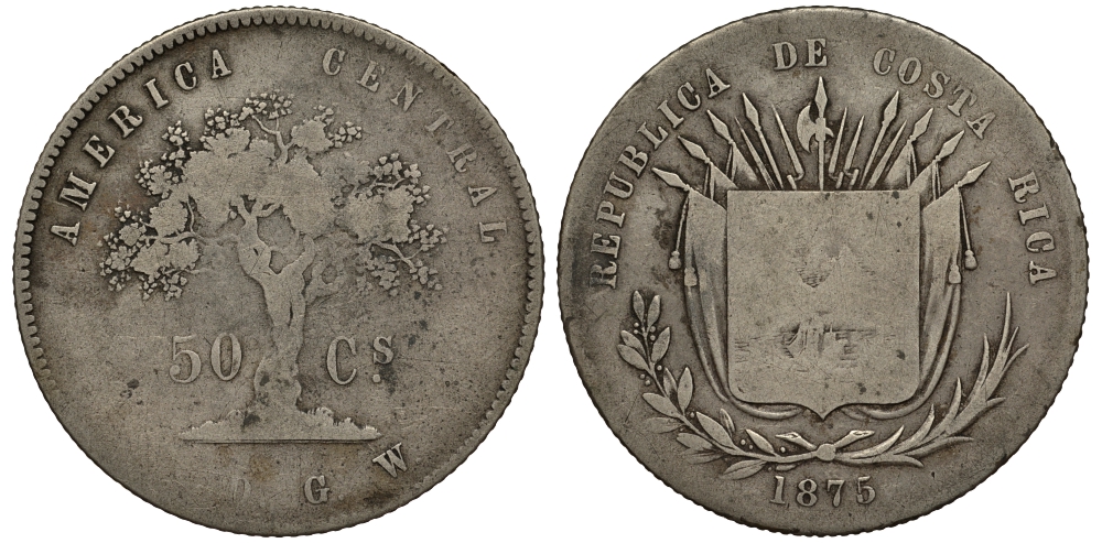 Коста-Рика 50 сентимо 1875 KM 112 серебро 272-632
