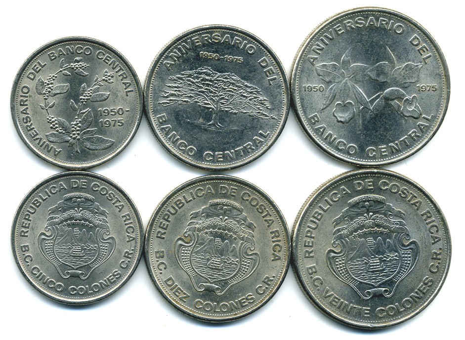 Коста-Рика лот из 3 монет 1975 25 лет Центральному банку, (5, 10, 20 колон) KM 203, 204, 205 никель UNC N2-40