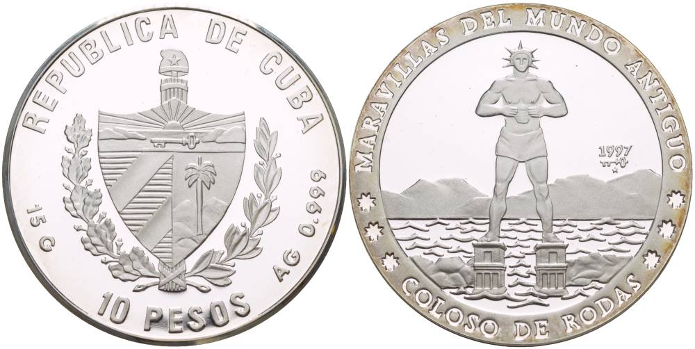 ----Куба 10 песо 1997 серия семь чудес света, колосс Родосский KM 596 серебро PROOF 02-037-43