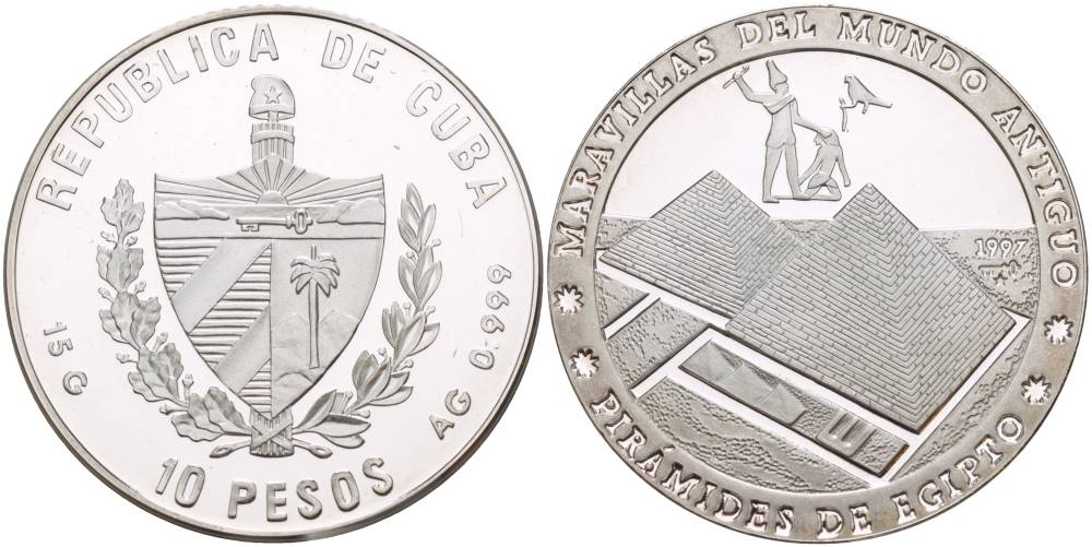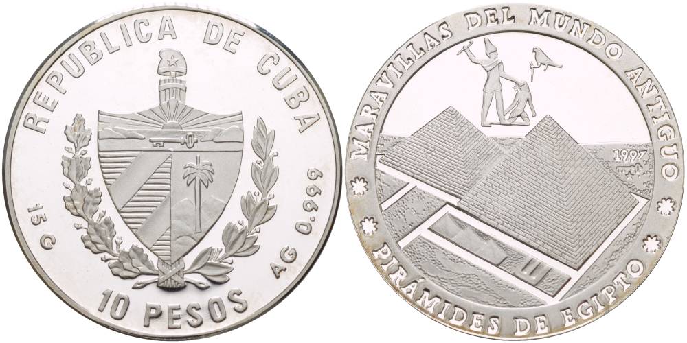 ----Куба 10 песо 1997 серия семь чудес света, пирамиды Гизы KM 597 серебро PROOF 04-092-34