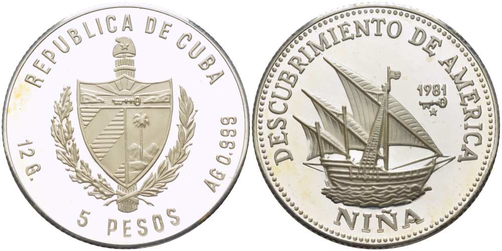 Куба 5 песо 1981 открытие Америки, парусники Колумба, испанская каравелла Нинья, тираж 1000 экземпляров KM 71 серебро PROOF 1087-9-52