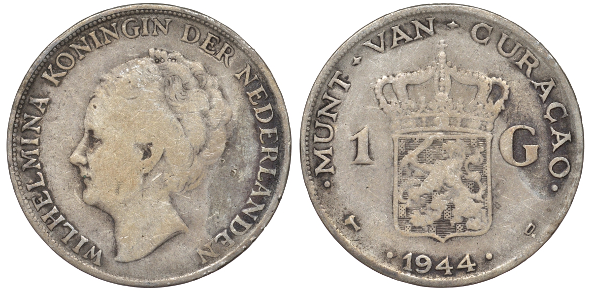 КЮРАСАО 1 ГУЛЬДЕН 1944 D ВИЛЬГЕЛЬМИНА KM 45 серебро 36-326