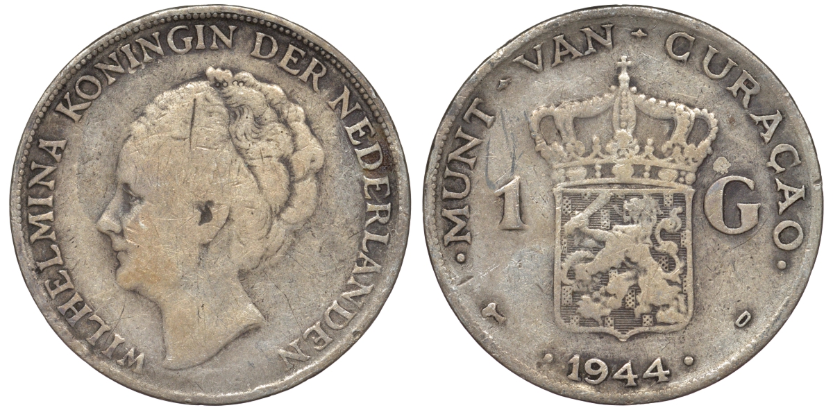 КЮРАСАО 1 ГУЛЬДЕН 1944 D ВИЛЬГЕЛЬМИНА KM 45 серебро 36-327