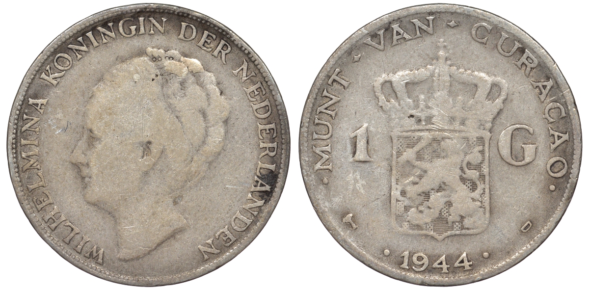 КЮРАСАО 1 ГУЛЬДЕН 1944 D ВИЛЬГЕЛЬМИНА KM 45 серебро 36-711
