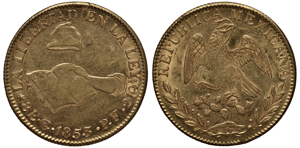 Мексика 8 эскудо 1853 KM 383.7 золото 10-010-53