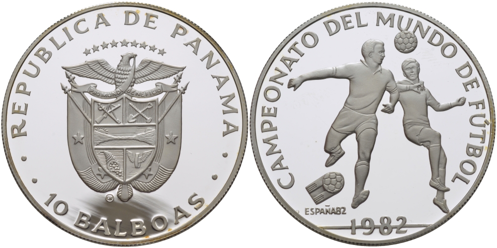 Панама 10 бальбоа 1982 чемпионат мира по футболу в Испании 1982 года, атака головой, игра в воздухе KM 78 серебро PROOF 02-208-25