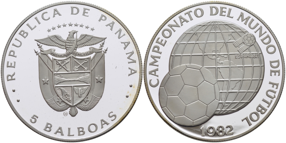 Панама 5 бальбоа 1982 чемпионат мира по футболу в Испании 1982 года, мяч на фоне глобуса KM 77 серебро PROOF 01-148-11