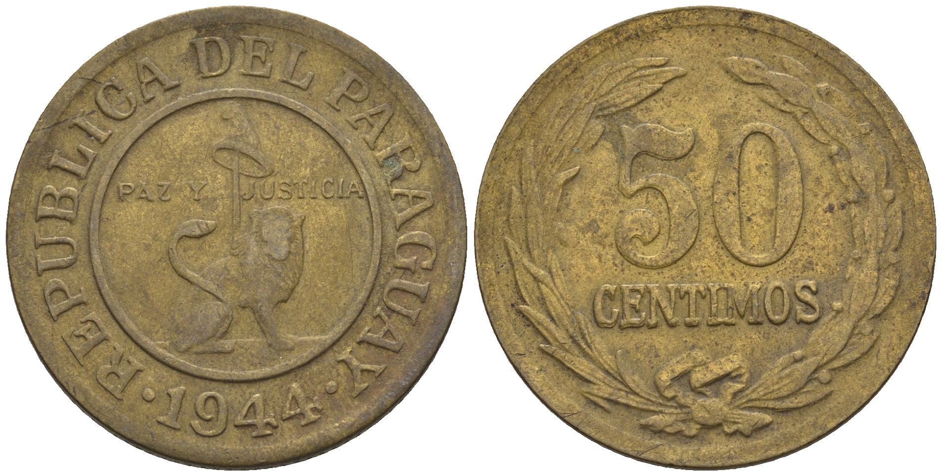 Парагвай 50 сентимо 1944 лев, фригийский колпак на шесте KM 24 алюминиевая бронза 4177-942