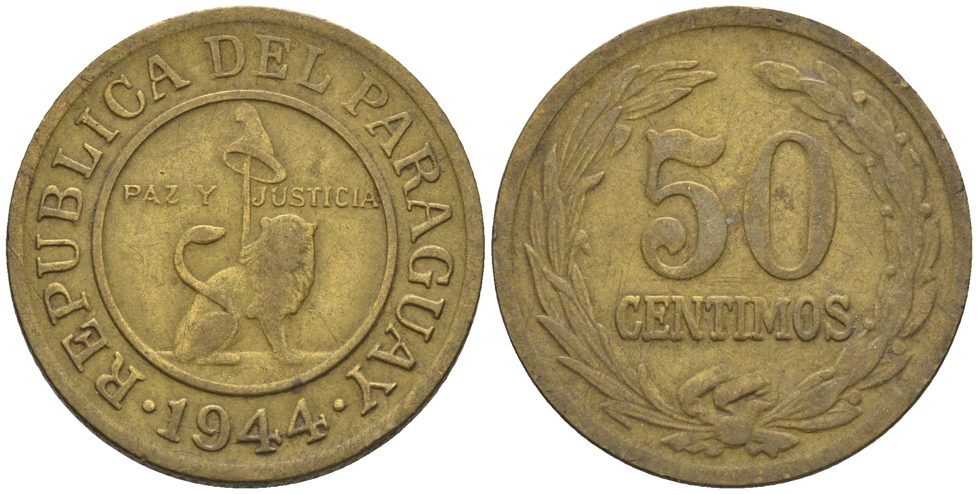 Парагвай 50 сентимо 1944 лев, фригийский колпак на шесте KM 24 алюминиевая бронза 4177-944