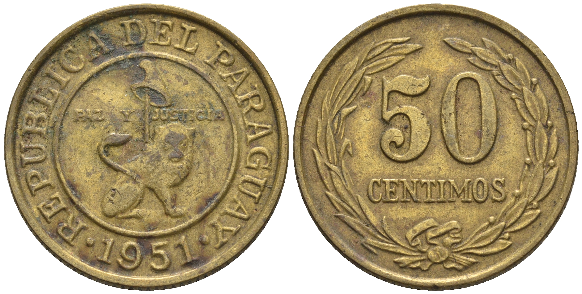 Парагвай 50 сентимо 1951 лев, фригийский колпак на шесте KM 24 алюминиевая бронза 4177-757