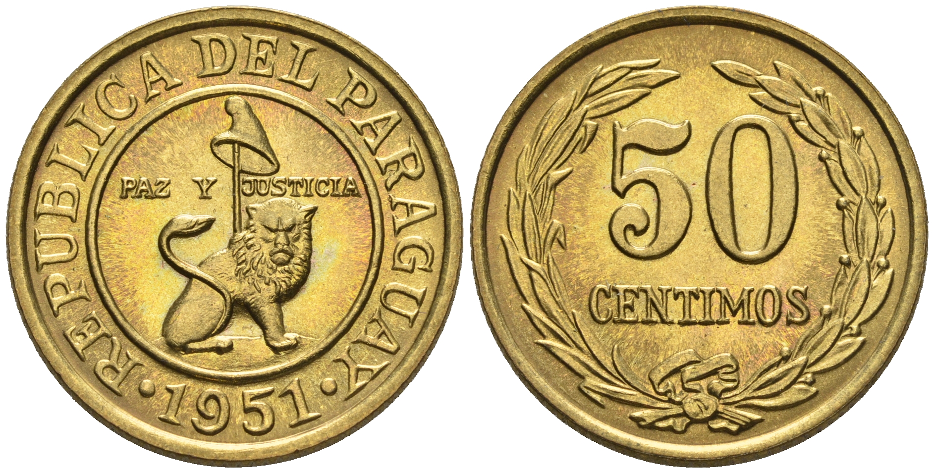 Парагвай 50 сентимо 1951 лев, фригийский колпак на шесте KM 24 алюминиевая бронза aUNC 4177-612