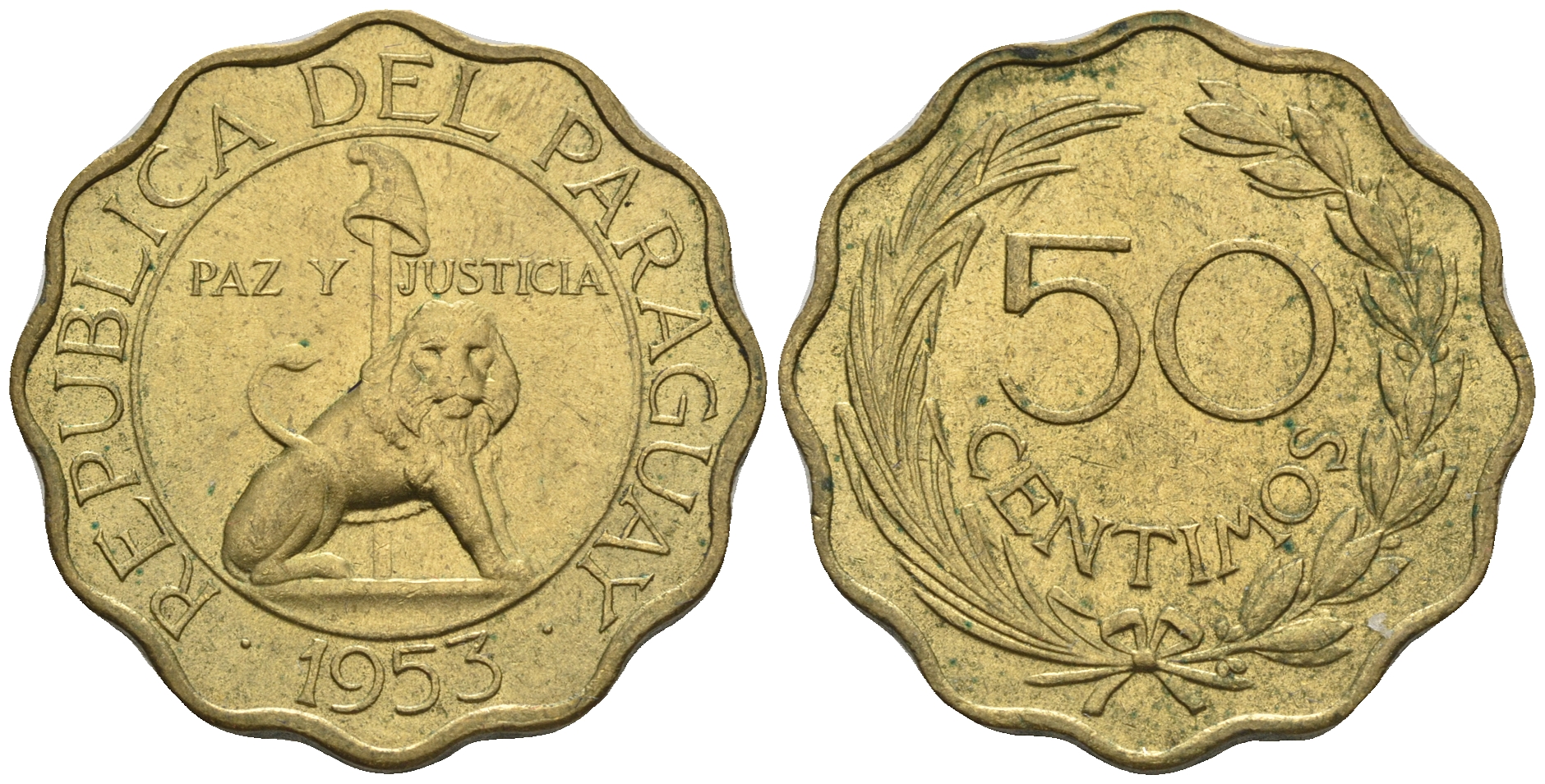 Парагвай 50 сентимо 1953 лев, фригийский колпак на шесте KM 28 алюминиевая бронза aUNC 4176-1211