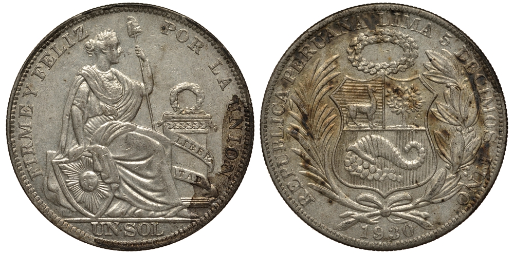Перу 1 соль 1930 KM 218.2 серебро aUNC 272-845