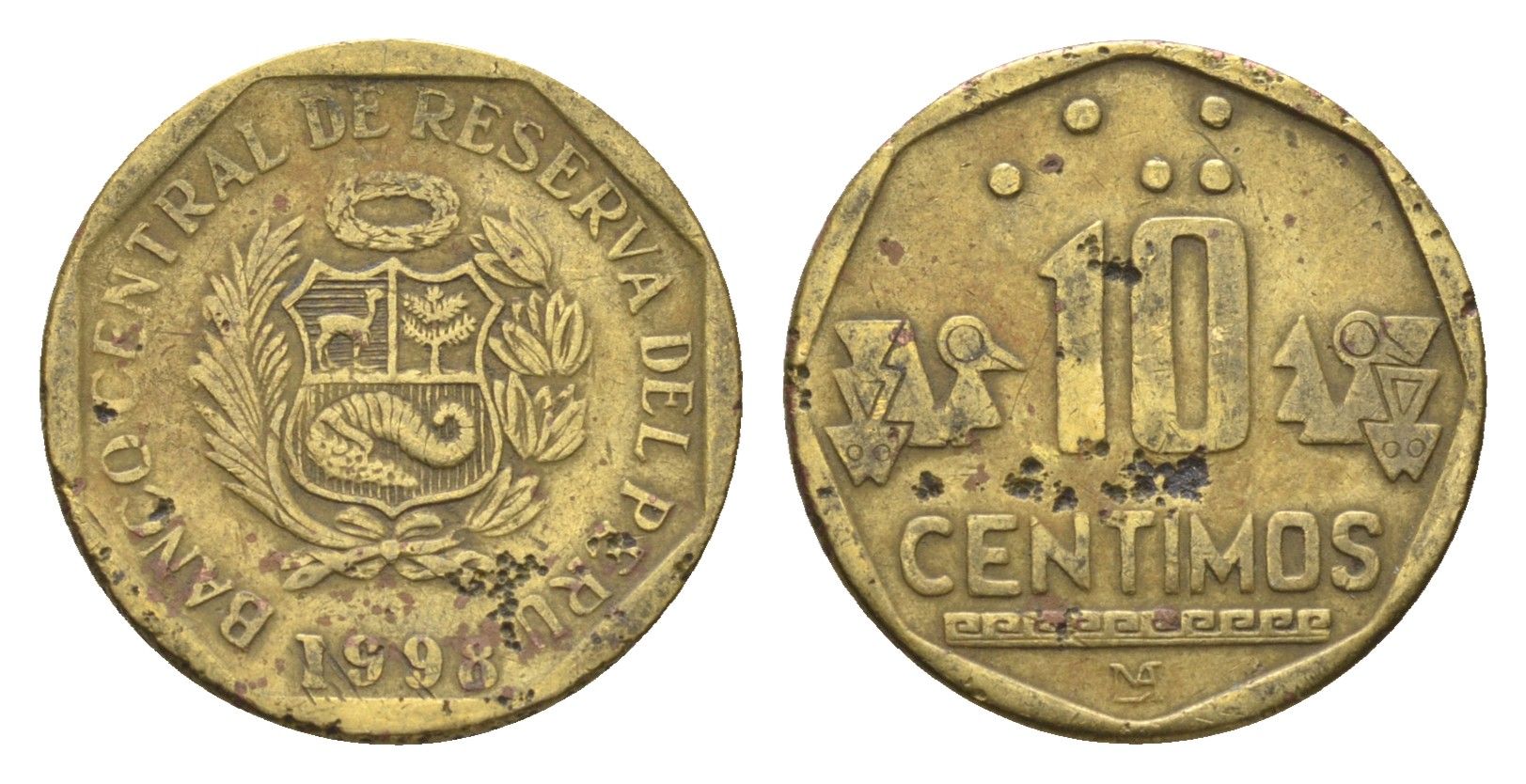 Перу 10 сентимо 1998 KM 305 латунь 4664-446