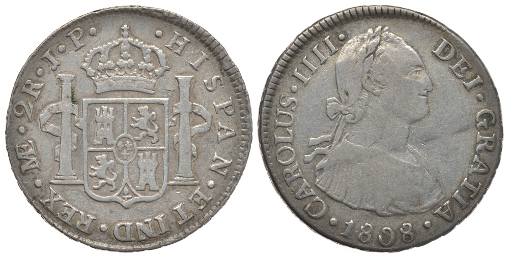 ПЕРУ 2 РЕАЛА 1808 JP КАРЛ IIII KM 95 серебро 1522-812