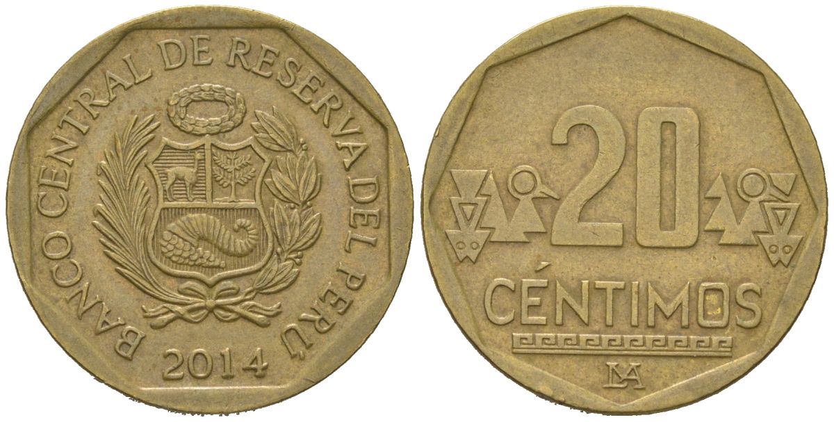 Перу 20 сентимо 2014 LIMA KM 306.4 латунь 4523-254