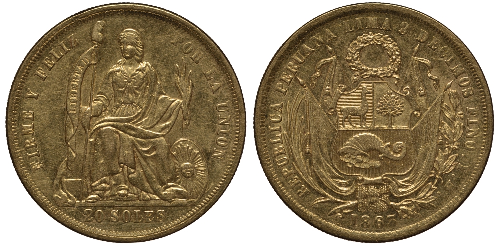 Перу 20 солей - 8 эскудо 1863 KM 194 золото 10-010-52